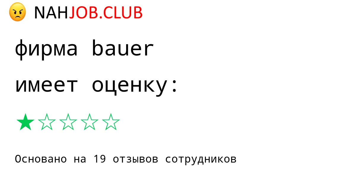 🔴 В списке 1 отзыв бывших работников про ФИРМА BAUER по городу Тюмень с рейтингом 1 из 5 . Это искренние мнения про атмосферу, доходы, штрафы, отпуска.