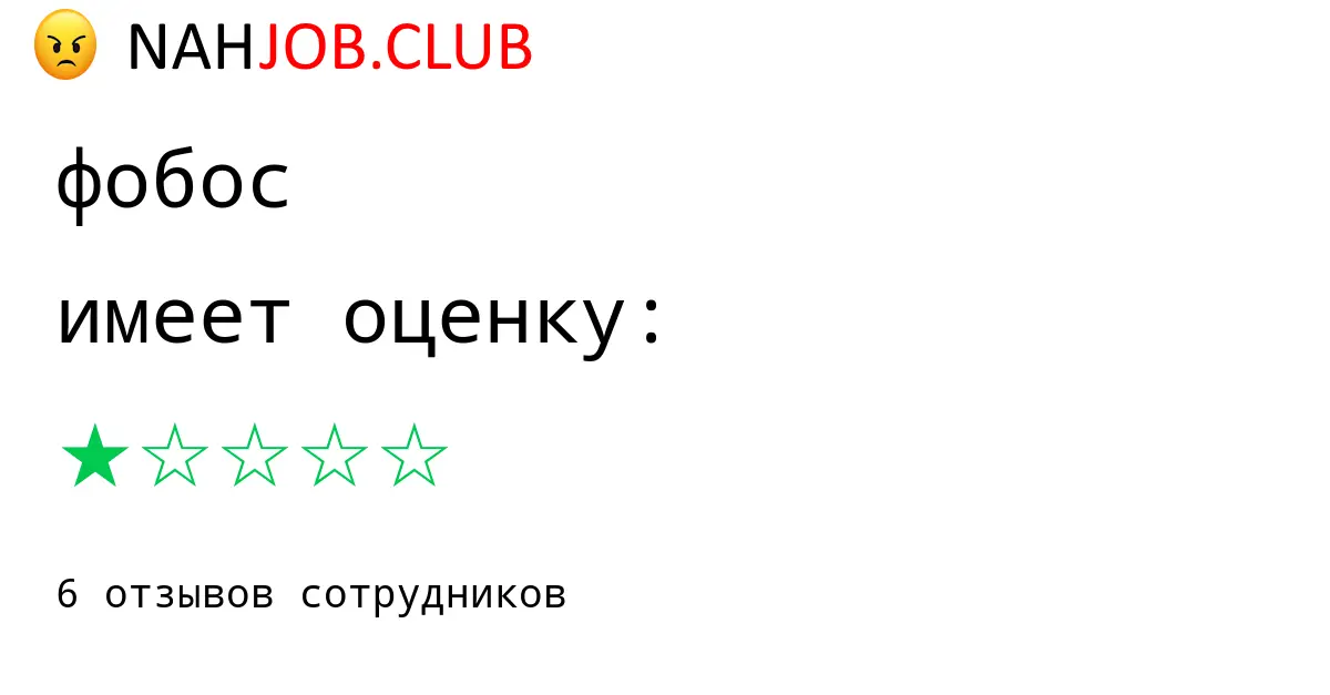 🔴 Мы собрали 1 отзыв бывших сотрудников про ФОБОС по городу Стерлитамак с рейтингом 1 из 5 . Это данные изнутри про зарплату, коллектив, штрафы.