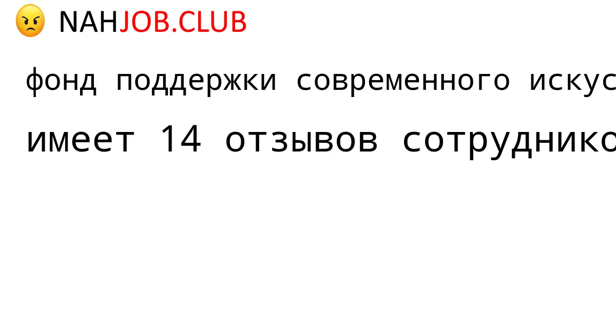 🔴 Изучаете вакансию специалист компании ФОНД ПОДДЕРЖКИ СОВРЕМЕННОГО ИСКУССТВА ВИНЗАВОД? Почитайте 1 отзыв бывших сотрудников про работу по должности Специалист в ФОНД ПОДДЕРЖКИ СОВРЕМЕННОГО ИСКУССТВА ВИНЗАВОД