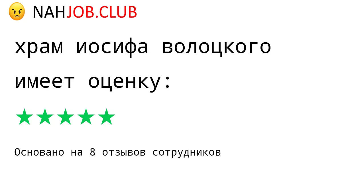 🔴 Мы собрали 8 отзывов бывших сотрудников про ХРАМ ИОСИФА ВОЛОЦКОГО с рейтингом 5 из 5 . Это данные изнутри про зарплату, коллектив, штрафы.