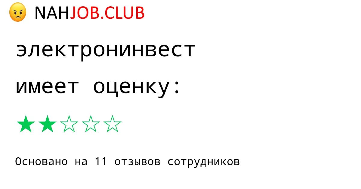 🔴 В базе Nahjob 9 отзывов и мнений бывших и действующих работников про ЭЛЕКТРОНИНВЕСТ по городу Зеленоград с рейтингом 2 из 5 . Это реальные отклики про зп, атмосферу, штрафы.