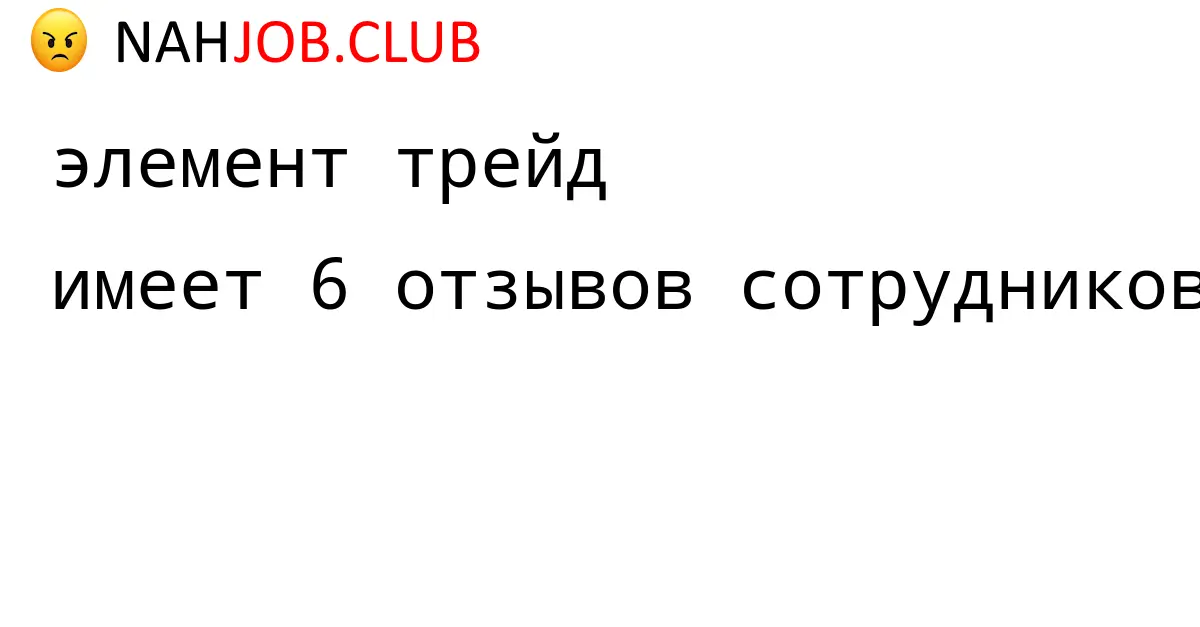 Компания ЭЛЕМЕНТ ТРЕЙД . Рынок труда нельзя назвать идеальным, если у вас есть опыт работы в данной компании, вы можете оставить отзыв про ЭЛЕМЕНТ ТРЕЙД - это, прежде всего, поможет возможным соискателям не ошибиться в выборе, не сделать необдуманный шаг.
