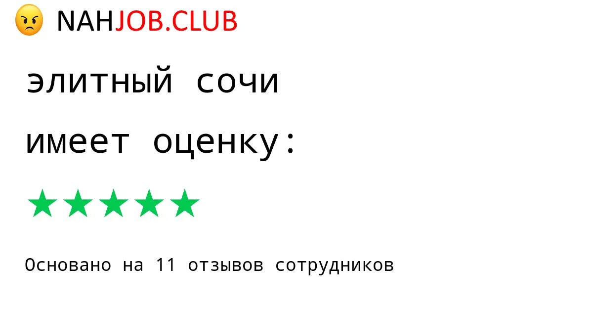 🔴 В базе Nahjob 11 отзывов и мнений бывших и действующих работников про ЭЛИТНЫЙ СОЧИ по городу Сочи с рейтингом 5 из 5 . Это реальные отклики про зп, атмосферу, штрафы.