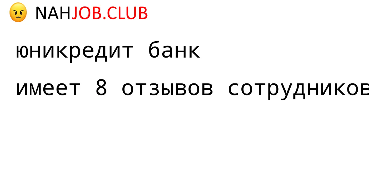 🔴 В базе Nahjob 8 отзывов и мнений бывших и действующих работников про ЮНИКРЕДИТ БАНК. Это реальные отклики про зп, атмосферу, штрафы.