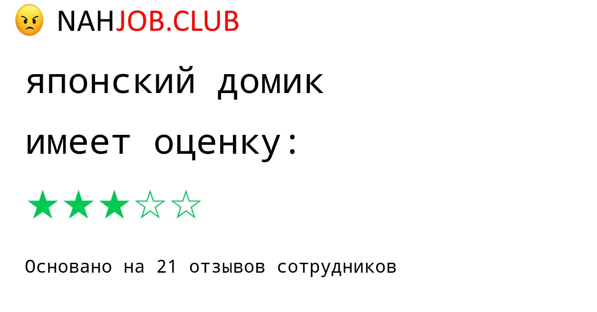🔴 В базе Nahjob 21 отзыв и мнений бывших и действующих работников про ЯПОНСКИЙ ДОМИК с рейтингом 3.4 из 5 . Это реальные отклики про зп, атмосферу, штрафы.