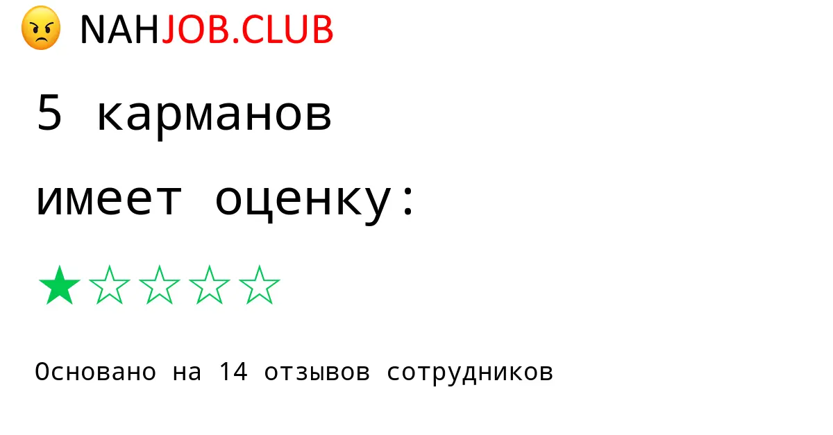 🔴 Изучаете вакансию Кассир продавец компании 5 КАРМАНОВ? Почитайте 1 отзыв бывших сотрудников про работу по должности Кассир продавец в 5 КАРМАНОВ