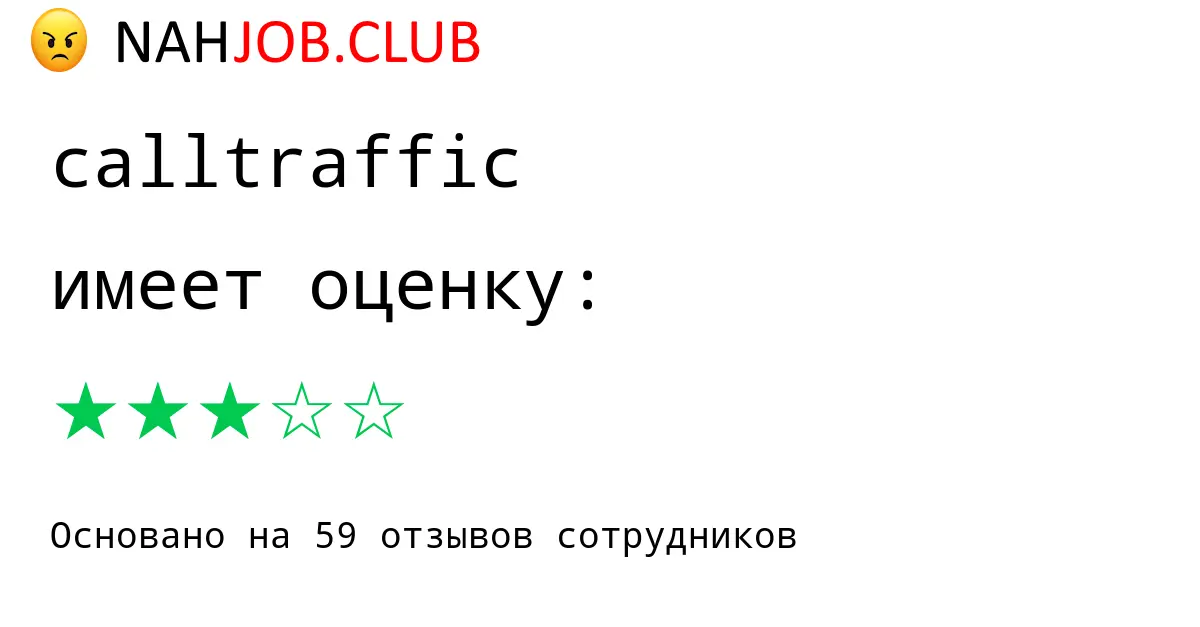 🔴 В базе Nahjob 5 отзывов и мнений бывших и действующих работников про CALLTRAFFIC по городу Ижевск . Это реальные отклики про зп, атмосферу, штрафы.