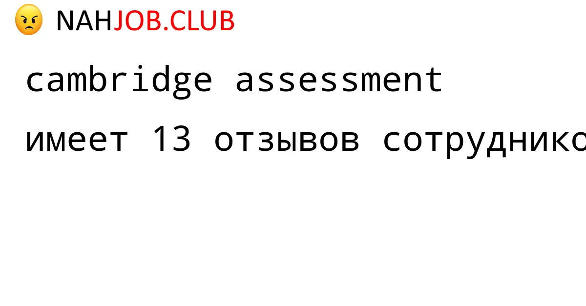 🔴 Изучаете вакансию оператор компании CAMBRIDGE ASSESSMENT? Почитайте 1 отзыв бывших сотрудников про работу по должности Оператор в CAMBRIDGE ASSESSMENT