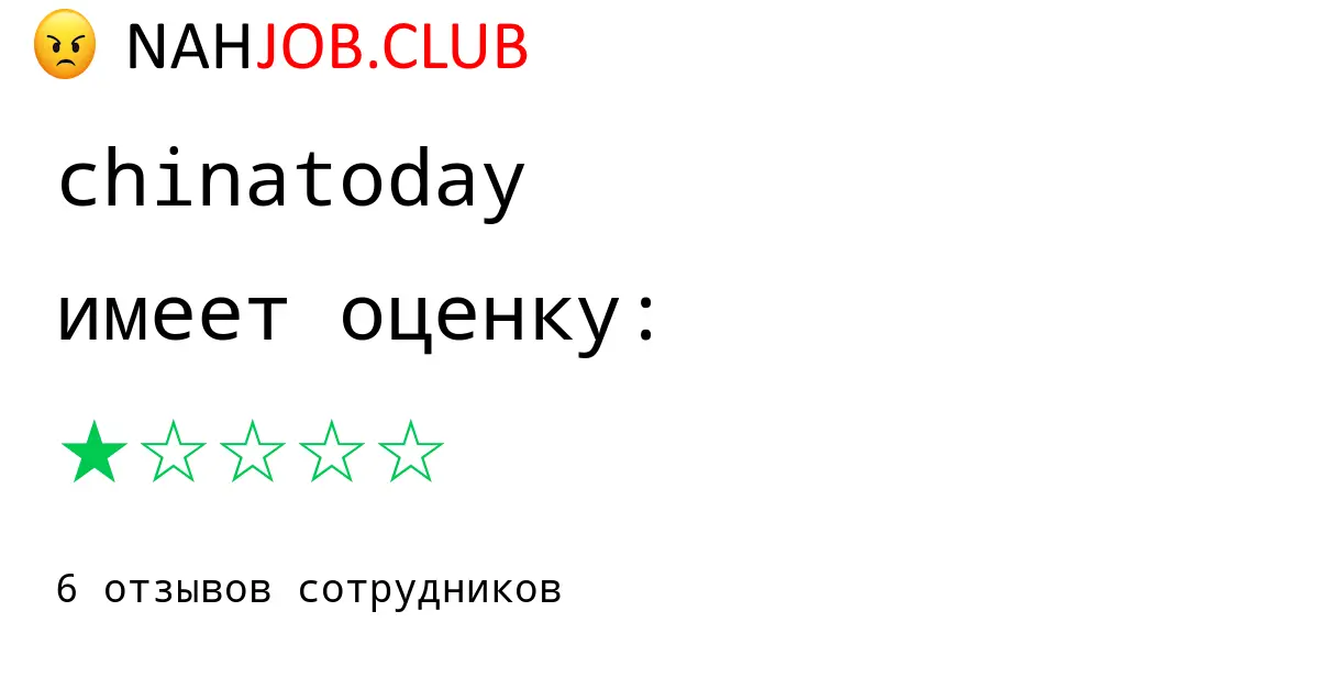 🔴 Изучаете вакансию Любая компании CHINATODAY? Почитайте 1 отзыв бывших сотрудников про работу по должности Любая в CHINATODAY