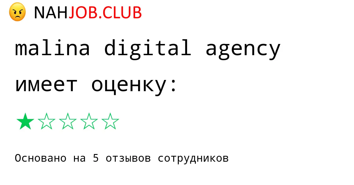 🔴 Изучаете вакансию Проджект менеджер компании MALINA DIGITAL AGENCY? Почитайте 1 отзыв бывших сотрудников про работу по должности Проджект менеджер в MALINA DIGITAL AGENCY