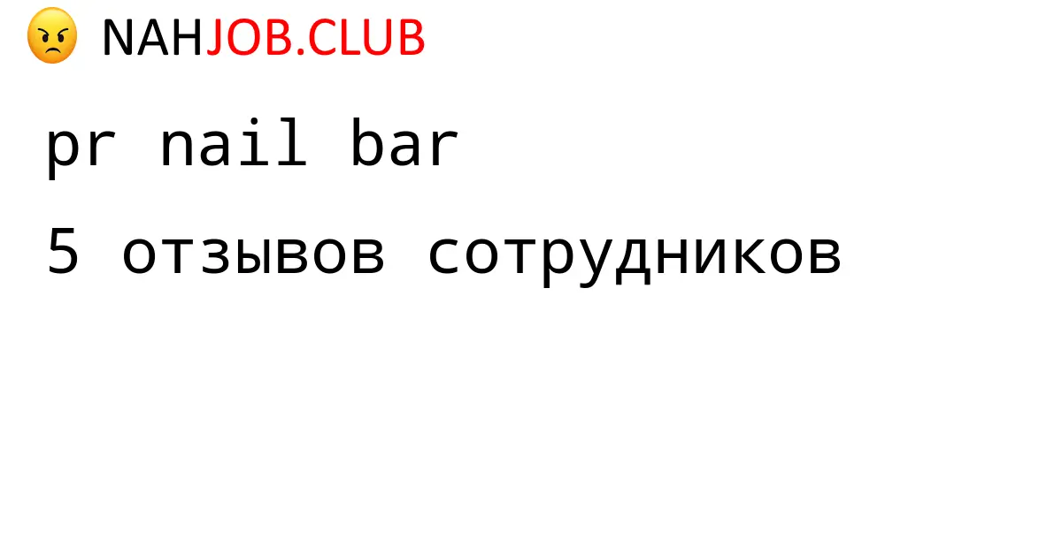 🔴 Мы собрали 5 отзывов бывших сотрудников про PR NAIL BAR по городу Москва . Это данные изнутри про зарплату, коллектив, штрафы.