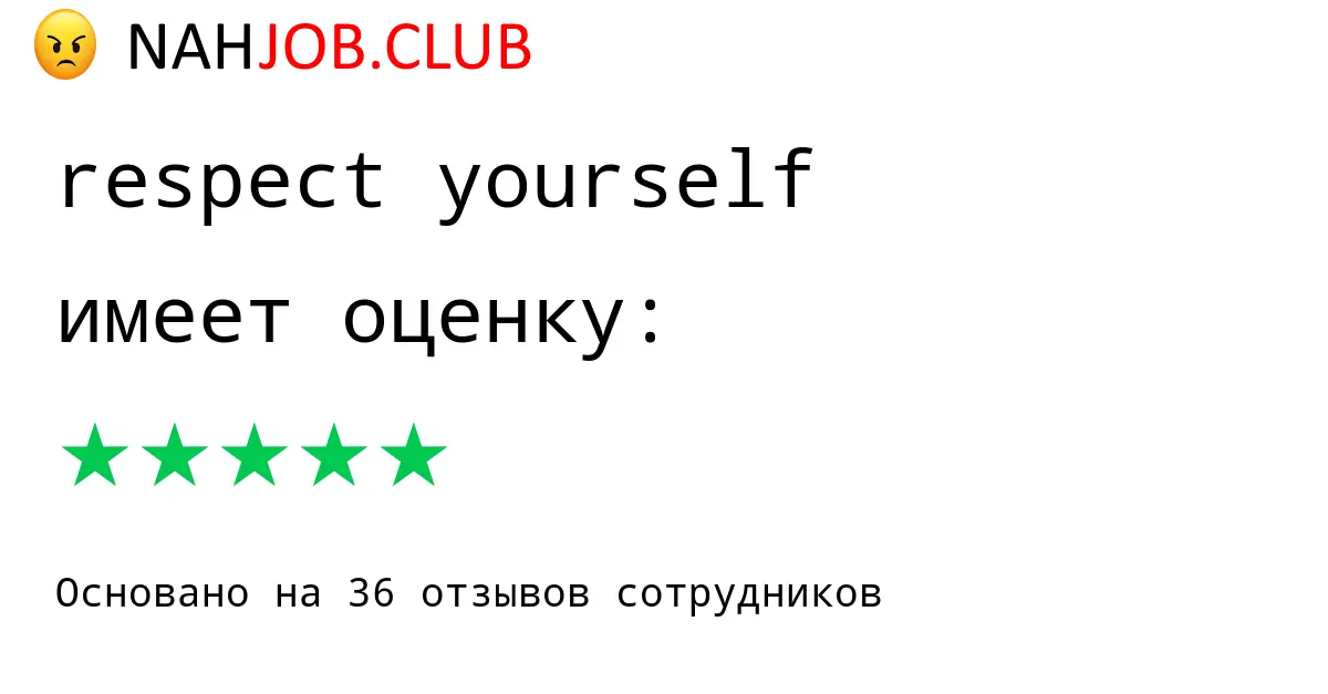 🔴 Мы собрали 36 отзывов бывших сотрудников про RESPECT YOURSELF с рейтингом 5 из 5 . Это данные изнутри про зарплату, коллектив, штрафы.