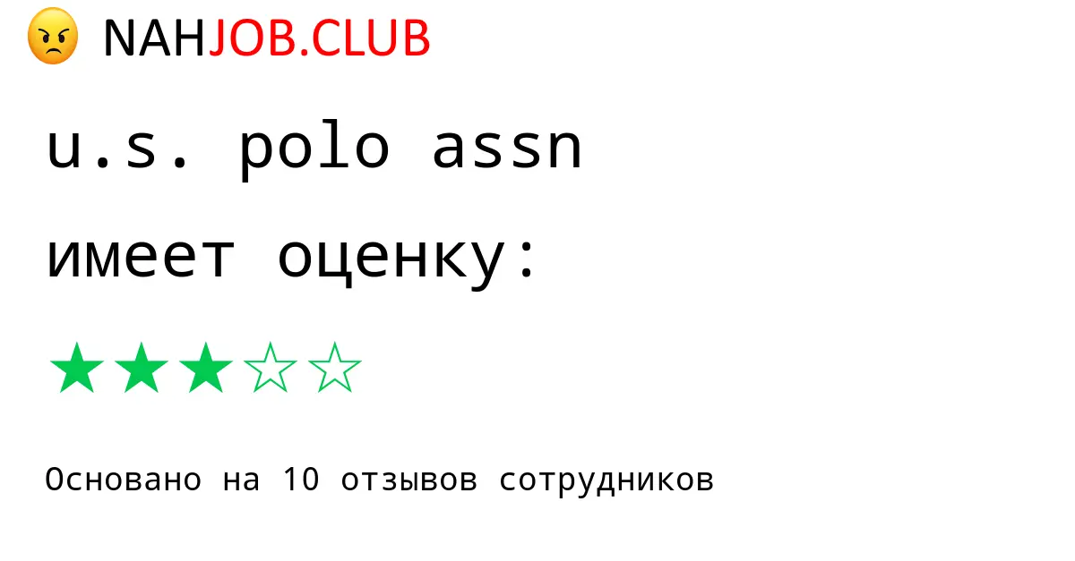 🔴 В списке 10 отзывов бывших работников про U.S. POLO ASSN с рейтингом 3 из 5 . Это искренние мнения про атмосферу, доходы, штрафы, отпуска.