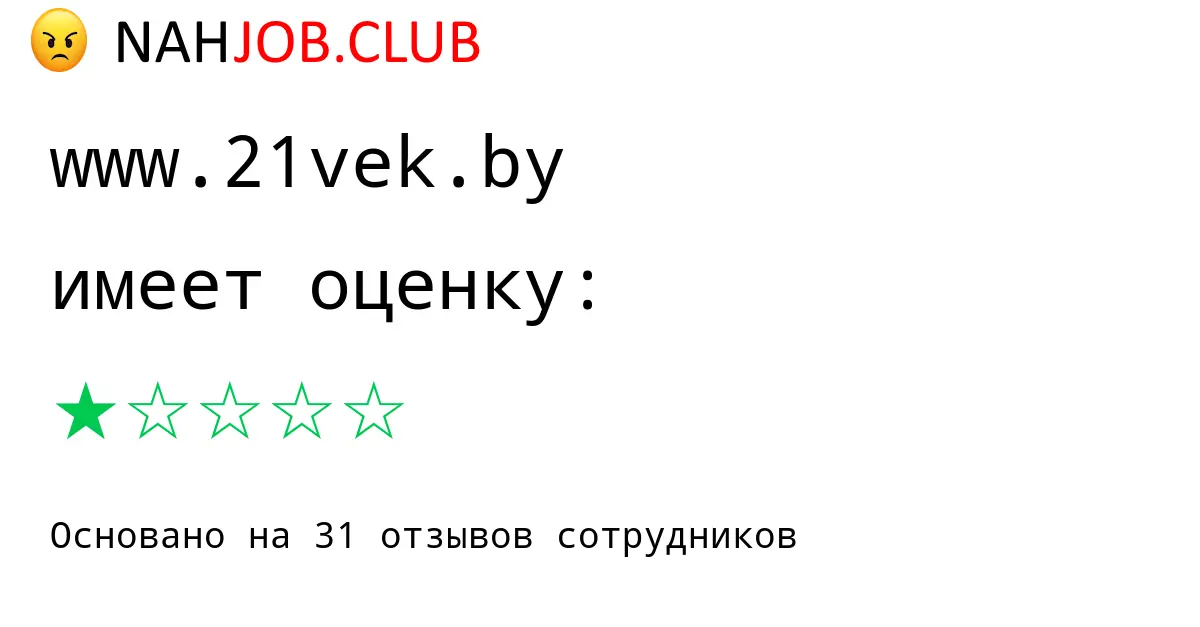🔴 В базе Nahjob 28 отзывов и мнений бывших и действующих работников про WWW.21VEK.BY по городу Минск с рейтингом 1 из 5 . Это реальные отклики про зп, атмосферу, штрафы.