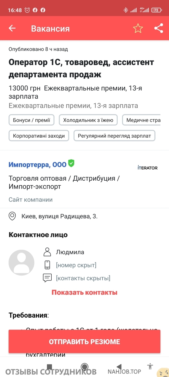 [М.] Вы ведёте себя прямо совсем неприлично. Теперь понятно почему у Вас такие большие перерывы между местами работы и откуда Ваши рассказы про оформленный на Вас ФОП и что поэтому Вы не можете оформиться к нам на работу с первого дня. Сразу боялись, что через несколько дней за прогулы могут уволить? И Ваши отсутствия без согласования это поиск работы, но зачем нас то очернять? А перед тем как писать такое, могли бы догадаться, что проверить как давно работает на рынке ООО Импортерра очень легко и на youcontrol и на любом другом сайте. О том, что мы продаем в том числе бу оборудование написано и на нашем сайте, поэтому это тоже любой соискатель может проверить. В реестре судебных решений отсутствуют решения суда связанные с Импортеррой, что означает что претензий у контрагентов к нам никогда не было. Остальную ерунду, конечно, не проверить. Наверное на это Вы и рассчитывали. Очень жаль, что у Вас такое желание насолить кому-то.