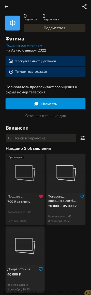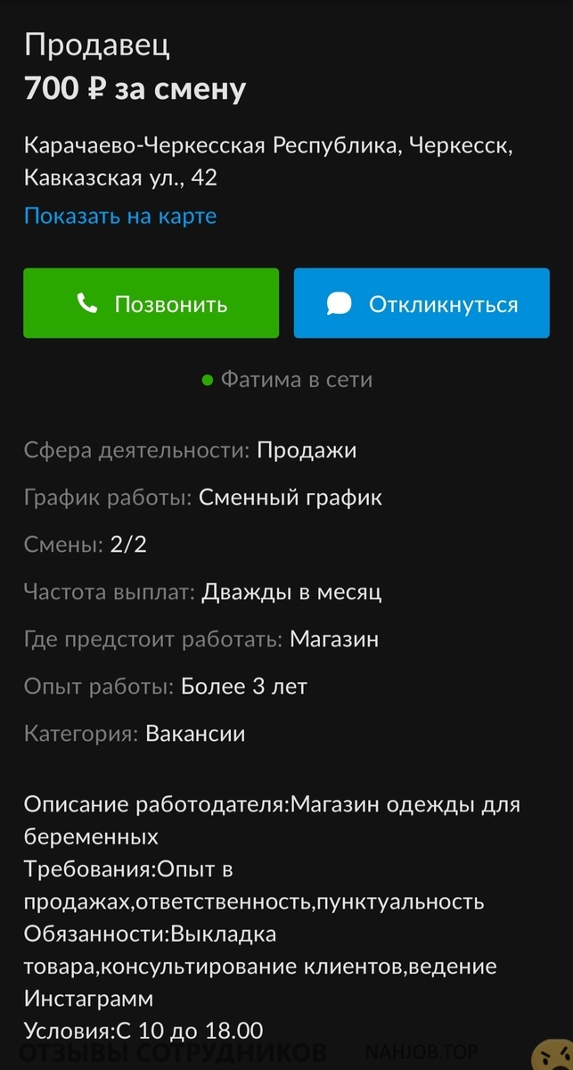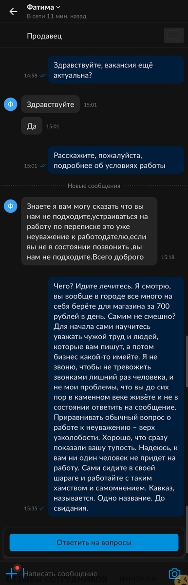 Я написала этой даме (на прикреплённых скриншотах), чтобы узнать пару вопросов об условиях работы, так как предпочитаю не звонить, чтобы не тревожить человека зря. Эта дама неадекватно отреагировала на мою попытку написать и приравняла это к неуважению. Хотелось бы уберечь всех тех, кто находится в поиске работы в Черкесске, от этого чудо-работодателя, так как проблем не оберётесь.