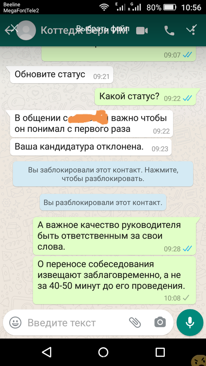 10.05.21 09.00 за час до начала собеседования я написал руководителю фирмы, что выезжаю. Ответ руководителя: «Стоп. Вторник». Я спросил, что договаривались на сегодня на 10.00 утра о проведении собеседования, давая понять, что нельзя было о переносе времени и даты проведения собеседования сообщить заранее. Руководитель фирмы ответил: «в общении с …, чтобы он понимал с первого раза».