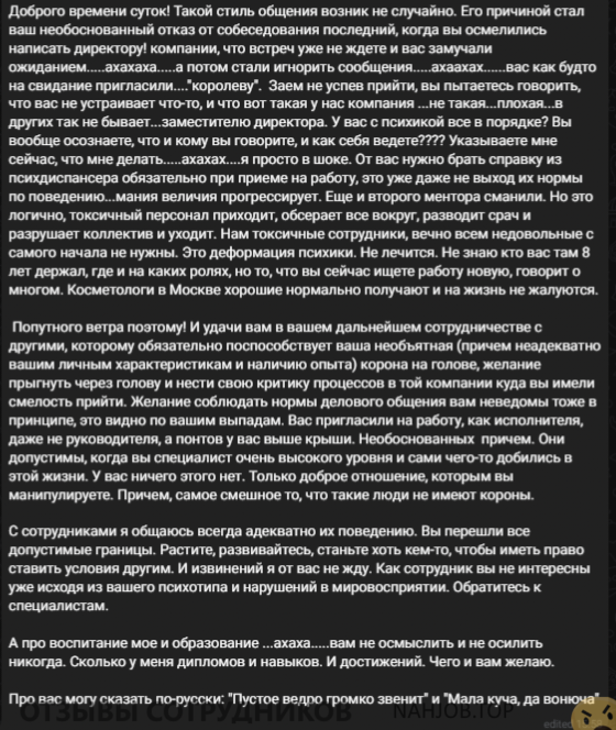 После того, как мне скинули трудовой договор, я сказала, что там есть несколько орфографических ошибок, на что заместитель директора в лице HR'а мне ответила матом и сказала исправить их самой. После моего ответа, что я впервые сталкиваюсь с подобным отношением, меня вообще унизили и оскорбили (доказательства прилагаю). Женщина вела себя откровенно по-хамски.