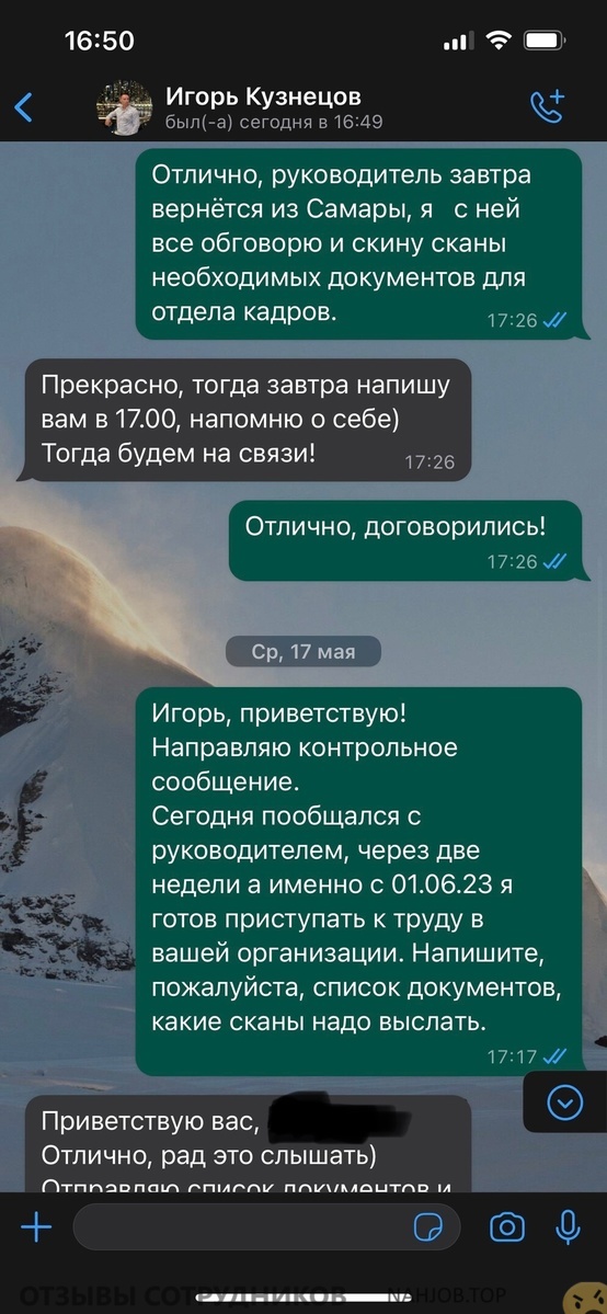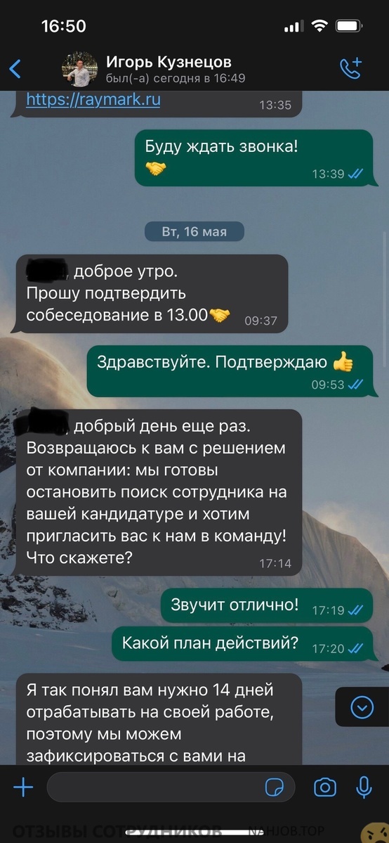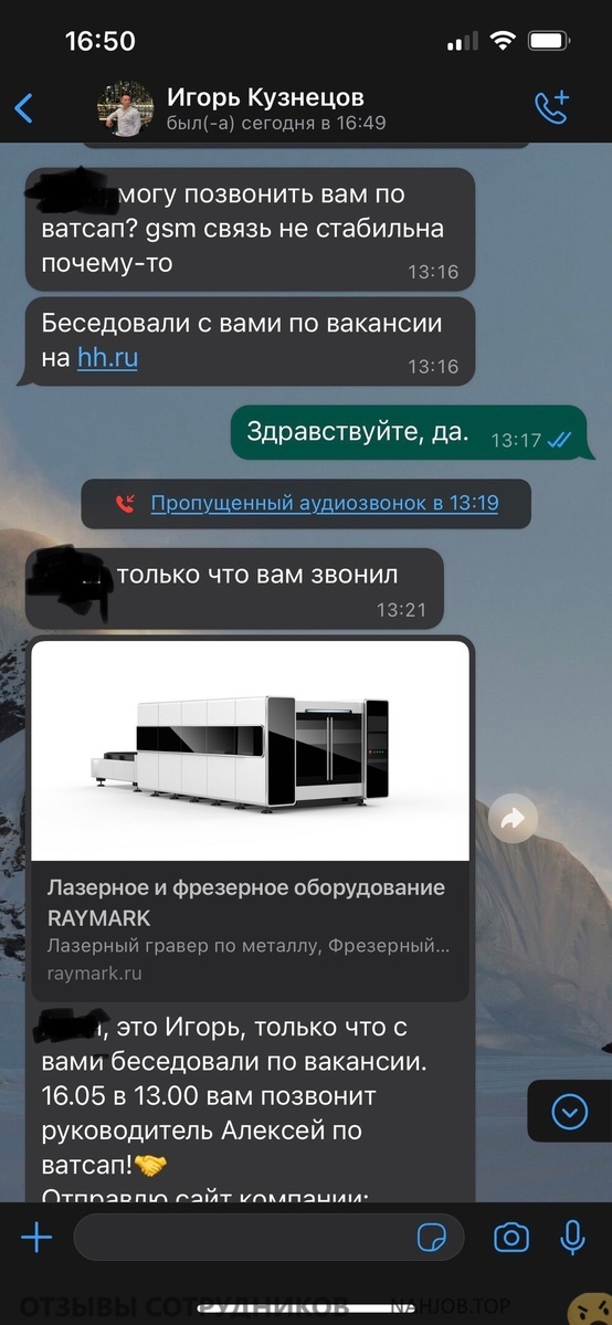 Позвонили мне по Ватсап-видео, там человек представился [А.], мы с ним пообщались полчаса, напел все те же сказки. Я ему сказал в конце разговора, только если будет принято решение в мою пользу, мне нужно уволиться и отработать две недели. На что мне сказали, хорошо, как примем решение, то Вам сообщим.