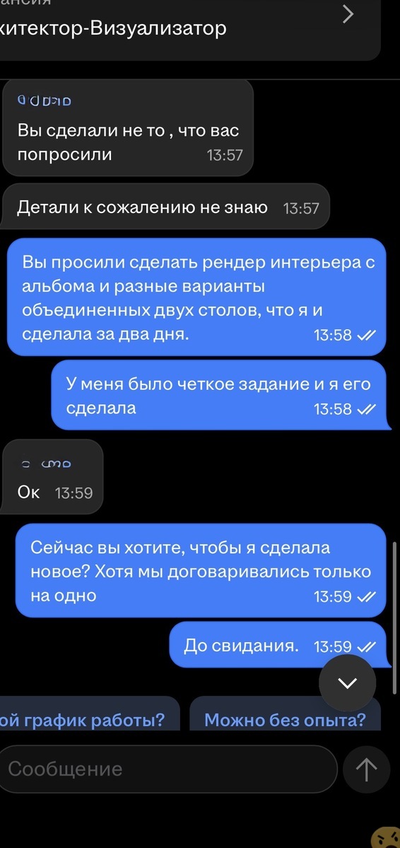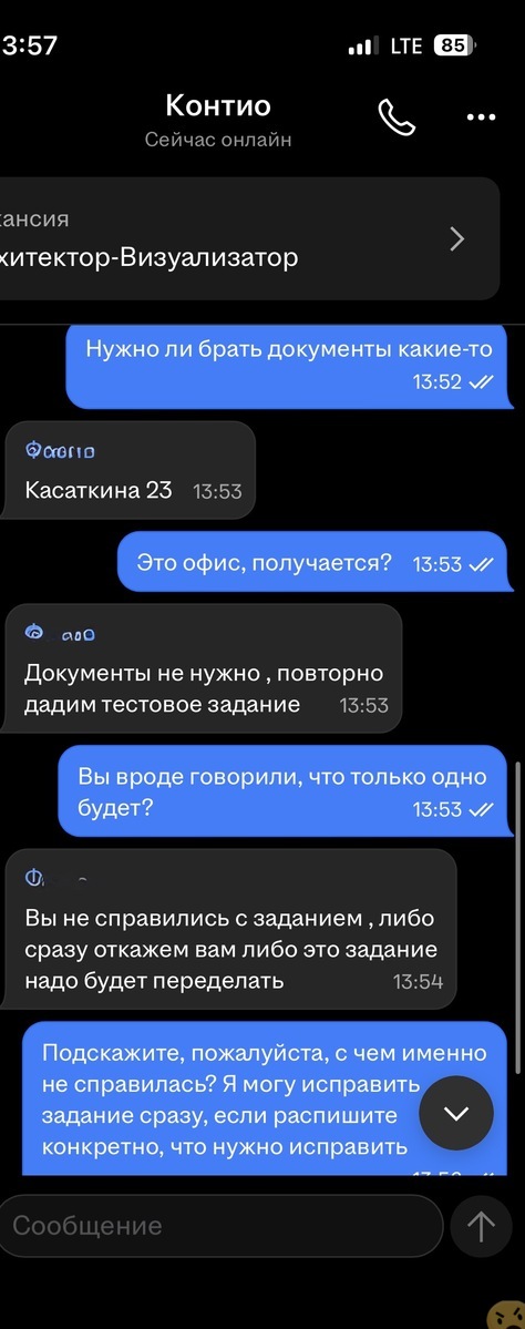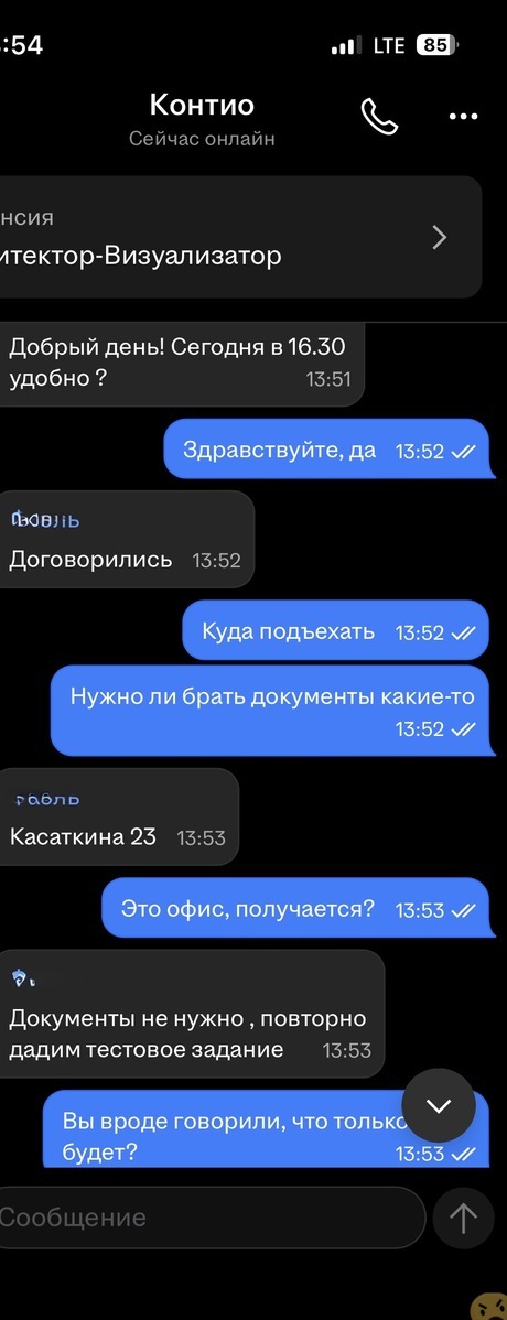 ооо «Контио» в г. Казань. Вакансия архитектор-визуализатор. В вакансии сказано офис в Корстоне, ЗП 80-100к, но по факту на собеседование меня пригласили в кофейню далеко от Корстона, где посмотрели портфолио, а потом повели в строящееся здание делать тестовое задание. В Корстоне находится их офис продаж, мне сказали, там вы работать не будете, а на вопрос, где работать, ответили «тут рядом». Завели в черновую комнату, сказали сделать тестовое задание, довольно муторное, и дали только два дня. По требованиям вакансия тоже отличается. Написали, что ищут визуализаторов, а по факту будешь вести весь проект одна: работа с клиентами, геодезистами, проектировать экстерьер, интерьер, ИЖС и т. д., еще и в выходной выходить по надобности. Нагруженность 4−5 проектов на человека. Сказали, что будет только одно тестовое задание и потом уже будем обсуждать договор. ЗП тоже мутно сказали 45−50 стажировка, потом «посмотрим».