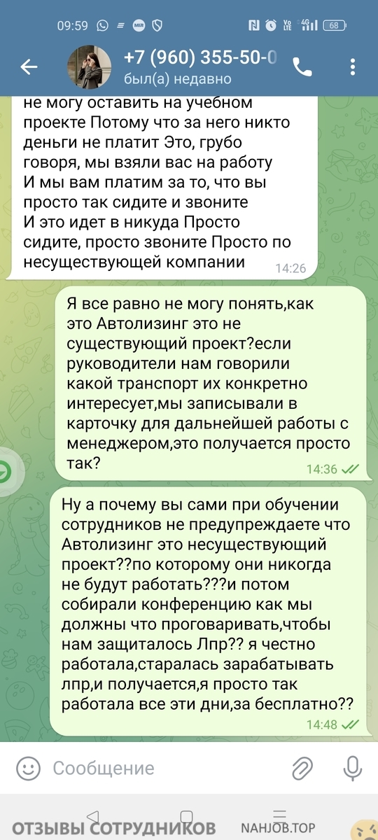 Меня зовут Г.Л.! Прошла обучение в Rocket call 15 февраля, работала уже с 17 февраля. Обучали нас автолизингу, стажировка и дальнейшая работа проходила по проекту Автолизинг. Компания никак не оформляет сотрудников, и что получилось? Когда подошло время выплаты зарплаты, они меня перекидывают на проект аутсорсинг, по которому меня вообще не обучали, что и как говорить, скрипт ужасный на два листа, я пишу супервайзеру Ю., а как мне сегодня по нему работать, я же ничего не понимаю? Она вообще на меня наехала, что Автолизинг это, вообще-то, придуманный проект для новичков, и компании выдуманные. Я говорю, интересно как-то выдуманные, система Скорозвон меня соединяла с настоящими компаниями, я даже вбивала некоторые в браузере, там и руководители и отделы все как и в Скорозвоне, реальные люди! Старалась, делала по 300 звонков за 5 часов работы, приводила успешных ЛПР (лидов), руководство на фирму собиралось заключать договоры в лизинг на машины по 10 млн, МАЗы, трактора и т. п.! В итоге она мне сказала, что это выдумка, просто как тренировка, и не заплатили мне с 17 февраля по 3 марта НИ копейки! Это настолько было шоком для меня, я проплакала весь день, попала на скорую! У меня двое детей, я ждала, вот-вот оплатят мой труд, чтобы просто продукты было за что купить, в итоге меня просто удалили из рабочих чатов и все! Это что вообще такое! Как можно так обращаться с людьми! Текучка у них большая, каждый день наблюдала, что из чата удалили того или другого, но не вникала в это, почему! Теперь понимаю! Они набирают сотрудников, чтобы по 15 дней на них бесплатно работали, а потом их просто удаляют, не заплатив ни копейки! Поэтому нет никакого оформления! Как же горько на душе, что я попалась на крючок этих мошенников! Люди, будьте бдительными! Никуда потом не пожалуйся и ничего не сделаешь в итоге.