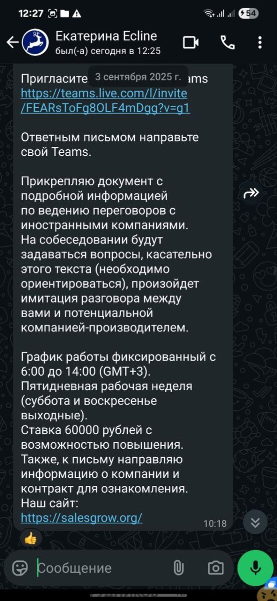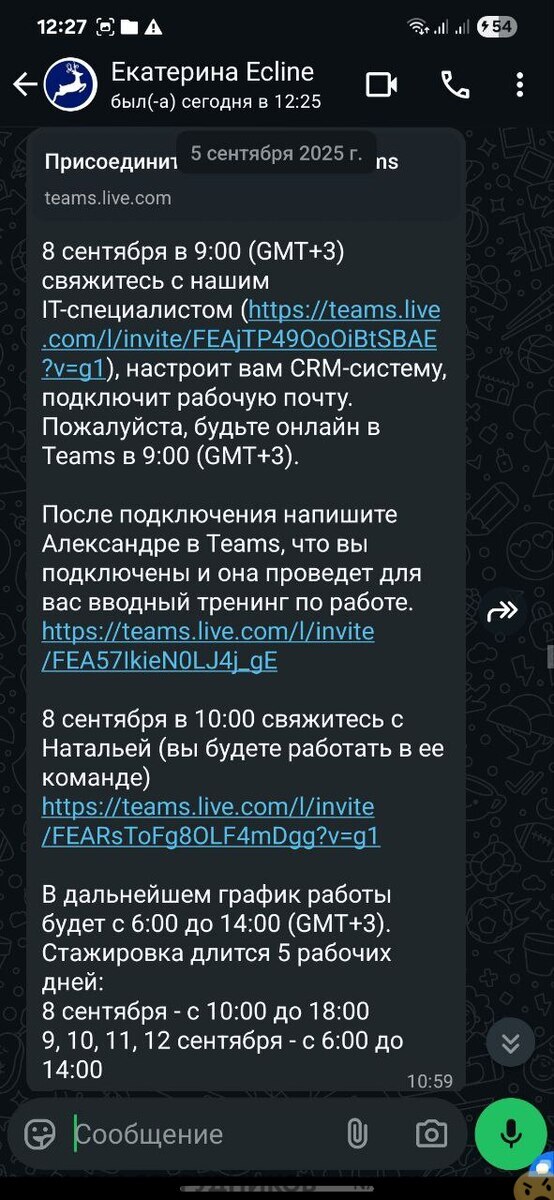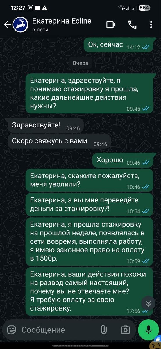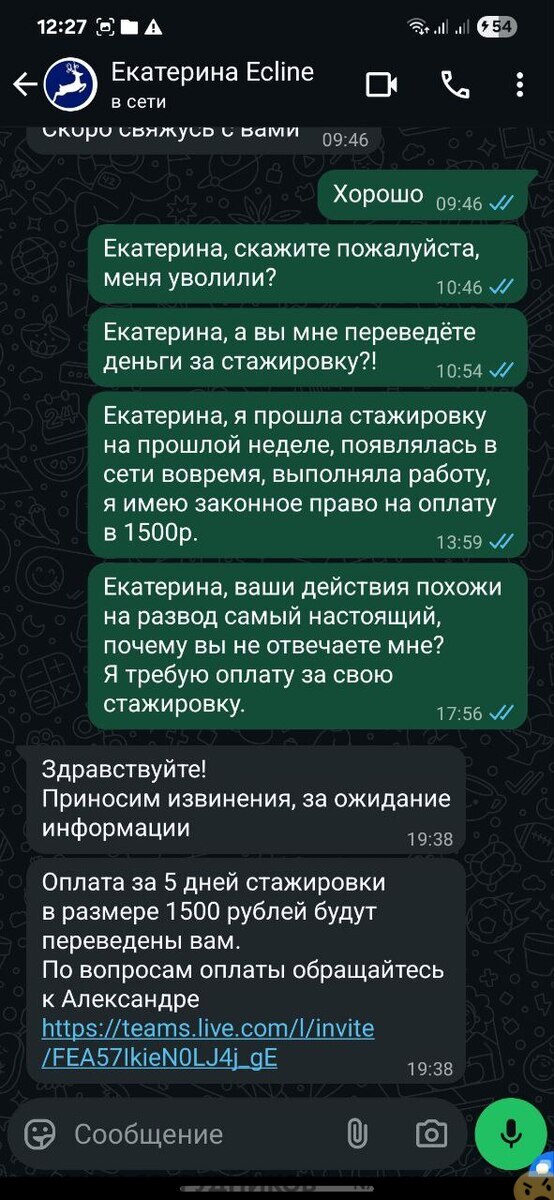 Недостатки:Работала в компании Ecline, вакансии которой нашла на сайте hh.ru. Компания набирает удалённых работников, моя должность была «менеджер-переводчик». Полное название компании — Ecline Solutions Private Limited, зарегистрирована в Индии. Перед собеседованием HR-менеджер Е. прислала документы о регистрации компании и файл для работы с инструкциями и скриптом для общения с иностранными клиентами. После успешного собеседования с топ-менеджером Н. меня приняли на работу. В первый день выяснилось, что представляться я буду как сотрудник Black Stone Solutions, которая имеет физический офис в Бразилии, а главный офис зарегистрирован в США (штат Вайоминг). Н. предоставила все необходимые документы, поэтому сразу никаких подозрений не возникло. Стажировка проходила с 8.09.2025 по 12.09.2025. Я работала 5 дней в неделю по 8 часов с 6:00 до 14:00 (мск). График и работа полностью подходили — я работаю по специальности, являюсь дипломированным переводчиком. Во время стажировки я заметила, что в моей команде топ-менеджера Н. было всего 5 человек, так что о какой «высокой конкуренции» может идти речь — непонятно. Также я заметила, что мне часто давали карточки с заданиями, которые были даны другим людям, то есть исполнители постоянно менялись. Сначала я не придала этому значения, подумав, что это обычная текучка: мало кто хочет работать, где нужно разговаривать на английском по телефону. За стажировку обещали оплату 1,500 рублей (≈16 USD), а зарплату за постоянную работу — 60,000 рублей (≈650 USD) на криптокошелек. В итоге 1,500 рублей мне так и не выплатили. HR Е. сначала игнорировала мои вопросы, а потом перенаправила меня к сотруднице А., которая одновременно выполняет роль администратора, IT-специалиста и бухгалтера. 15 сентября, в начале новой рабочей недели, меня неожиданно уволили. Н. написала: «К сожалению, на совещании приняли решение не продолжать и не подписывать контракт. У нас большая конкуренция, другой менеджер показал лучший результат.» В пятницу перед увольнением мне так и не сообщили, примут меня на работу или нет. Работа и график мне нравились, отношение Н. было отличным, зарплата устраивала. В целом складывается впечатление, что компания использует стажёров как дешёвую рабочую силу: набирают людей, дают задания, а после стажировки увольняют, выплачивая минимальную сумму. Хотя Ecline и Black Stone Solutions официально зарегистрированы, на практике это работа за копейки для высококвалифицированных специалистов, включая лингвистов и переводчиков. На hh.ru оставить отзыв о нарушениях ТК РФ невозможно — модерация блокирует такие сообщения. В общем, обходите эту компанию стороной, если не хотите отработать неделю за копейки.