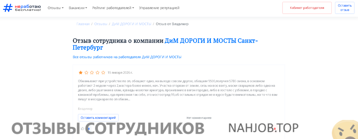 Кинули на зарплату при увольнении аж на 40 тысяч. Работал в Перми на Мостоотряд-1 АО Дороги и мосты (АО ДиМ). Шарага, самая настоящая. Инструмента нет, технологии работы придумываются из [censored] потому что мозгов нет. Сами пишут хорошие отзывы, либо просят работяг, кто вообще не понимает, что это дно. Про зарплату вранье начинается с объявления вакансии — на авито и ххру за смену, в договоре по приезду 160 р в час, остальное — как хорошо будете подлизывать и делать [censored]. Работа, кстати, поручается вообще несоответствующая оговоренной: приезжаешь на монтаж или сварку, попадаешь на лопату, на песок и щебень, либо ещё лучше — на бетон. Если мастеру, прорабу или начучастка взбредёт в голову поручить какую-нибудь хрень типа сбора мусора или уборки грязи с плит проезда лопатами, и вы откажетесь выполнять — очень быстро начнутся угрозы увольнением по статье. Зато шарага снимает красивые видеоролики о том, что у них всё хорошо. Только вот вся работа, соответствующая должности, у своих и блатных, остальным — хрень типа реставрации старого шпунта, который должен выглядеть новым, потому что новый сперли с участка, видимо. Общаги старый хлам, еда шляпа за 550 рублей в день, условия на площадках [censored] смены... Далее →