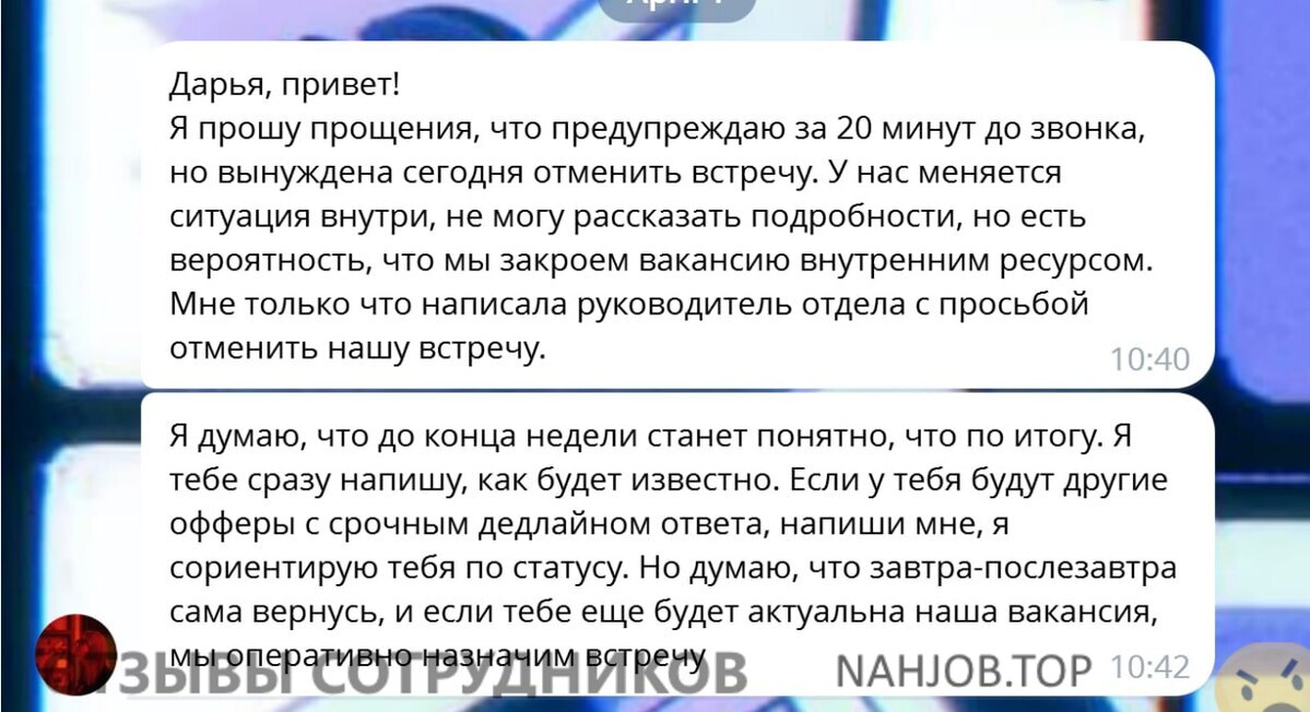 Проходила собеседование на должность копирайтера, прошло хорошо, дальше дали тестовое задание, после успешного выполнения назначили собеседование с руководителем. Но в день созвона написали за 20 минут со словами что внезапно передумали и решили закрыть вакансию внутренними ресурсами. Мне довольно сложно понять, каким образом можно настолько удобным образом внезапно осознать что в стороннем сотруднике нет нужды После выполнения объемного тестового. Многое говорит о компании и их так сказать уважении к времени и опыту кандидата.