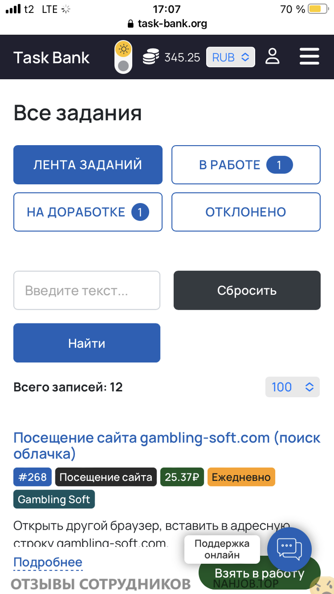 ✓ ПреимуществаРабота в Task-Bank стала для меня важным этапом жизни. Компания предлагает множество заданий для карьерного роста, что привлекло меня с самого начала. Руководство активно поддерживает инициативы сотрудников, что создает чувство вовлеченности в работу. Одним из главных плюсов является динамичная рабочая среда. Новые задания появляются регулярно, и это позволяет развивать разнообразные навыки. В компании ценят креативность и предлагают интересные задачи, которые помогают раскрыть потенциал. Гибкий график работы — еще одно преимущество, которое позволяет поддерживать баланс между личной жизнью и карьерой. Удаленная работа также доступна, что особенно ценно в наше время. Task-Bank заботится о развитии сотрудников, предлагая различные задания в разных сферах. Это дает возможность постоянно учиться и совершенствовать свои навыки. Стабильные выплаты без обманов Я рекомендую Task-Bank тем, кто ищет подработку в интернете со свободным графиком работы. Здесь можно получить ценный опыт и нормально подзаработать. Работа в этой компании оставила у меня положительные впечатления. В целом, Task-Bank — это отличное место для тех, кто ищет подработку и готов развиваться в этой сфере. Далее →✗ НедостаткиОднако, как и в любой компании, здесь есть свои недостатки. Работа требует усидчивости, внимательности. Иногда неправильно выполненное задание может оказаться штрафом, и вы потеряете заработок. Задания иногда бывают не до конца структурированы, что может затруднять адаптацию к новым задачам. Тем не менее, тех. поддержка всегда готова выслушать вас и помочь в решении этих проблем. Иногда возникают трудности с модерированием заданий, что может замедлять выполнение задач. Однако компания постоянно работает над улучшением этих аспектов, что внушает оптимизм. Далее →