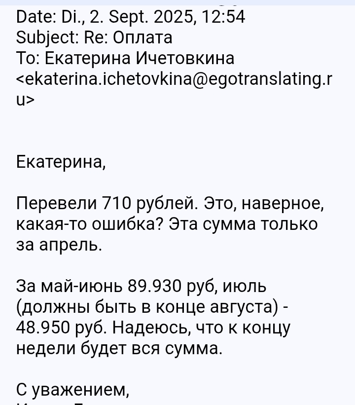 ✓ ПреимуществаВ компании я познакомился со многими хорошими людьми. Я с теплотой вспоминаю годы работы здесь и благодарен своим руководителям. Далее →✗ НедостаткиПрошло уже пять лет с моей работы в Эго Транслейтинг, и это уже, конечно, дела минувших дней. Тем не менее, узнав о вашем банкротстве, я не могу отказать себе в удовольствии и не поздравить вас с этим — по этому случаю я даже позволил себе сладкий чай с тортом. Я всегда говорил, что вы двигаетесь именно туда. Причины можно описывать по-разному, но корень — в целом низкий уровень психического здоровья руководства, и это было бы смешно, если бы не было так печально. Далее →