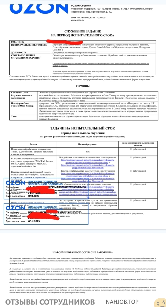 Меня пригласили на вакансию Специалист по поддержке сервиса Озон (Подгруппа Ozon Job) — удаленная вакансия. Оформление с первого дня по ТК РФ, оклад 40 000, на этом плюсы закончились. Период обучения с 06.11.2025 по 21.11.25, по пятидневке. Группа 43 человека. Обучение проходило в виде конференции, где девушка — руководитель группы обучения показывала нам слайды и читала вслух инструкции. На второй день обучения мне и остальным моим несостоявшимся коллегам пришли документы на подпись, а в том числе и служебное задание (документ во вложении). В служебном задании было ясно прописано, что для успешного прохождения обучения нужно было пройти все назначенные курсы вовремя, сдать итоговый тест и пройти стажировку (обработка чатов тикетов) с результатом не менее 80%. Курсы мною были пройдены все вовремя, итоговый тест был успешно сдан 13.11.2025.