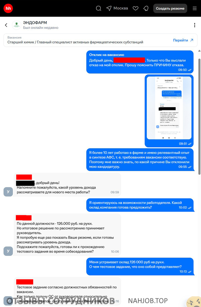 Дабы не быть голословной, прикладываю скриншоты переписки с эйчаром «Эндофарм».